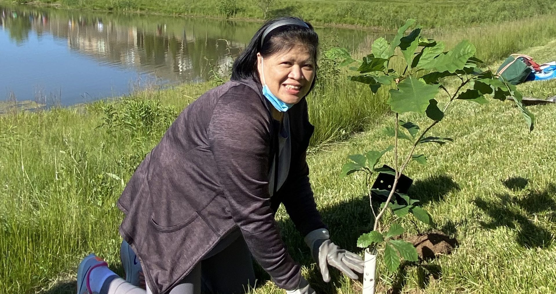 The ReForest London planting team was greeted with smiles and excitement as members of The Filipino-Canadian Association of Niagara (FCAN) unloaded from their buses, preparing for a wonderful morning of tree planting. This event, which took place on Wednesday, June 8th, was a partnership between ReForest London and FCAN to help naturalize the Byron Hills Stormwater Management Pond. The event was a success, and our 80+ volunteers made quick work of the site, planting a total of 176 trees and shrubs!