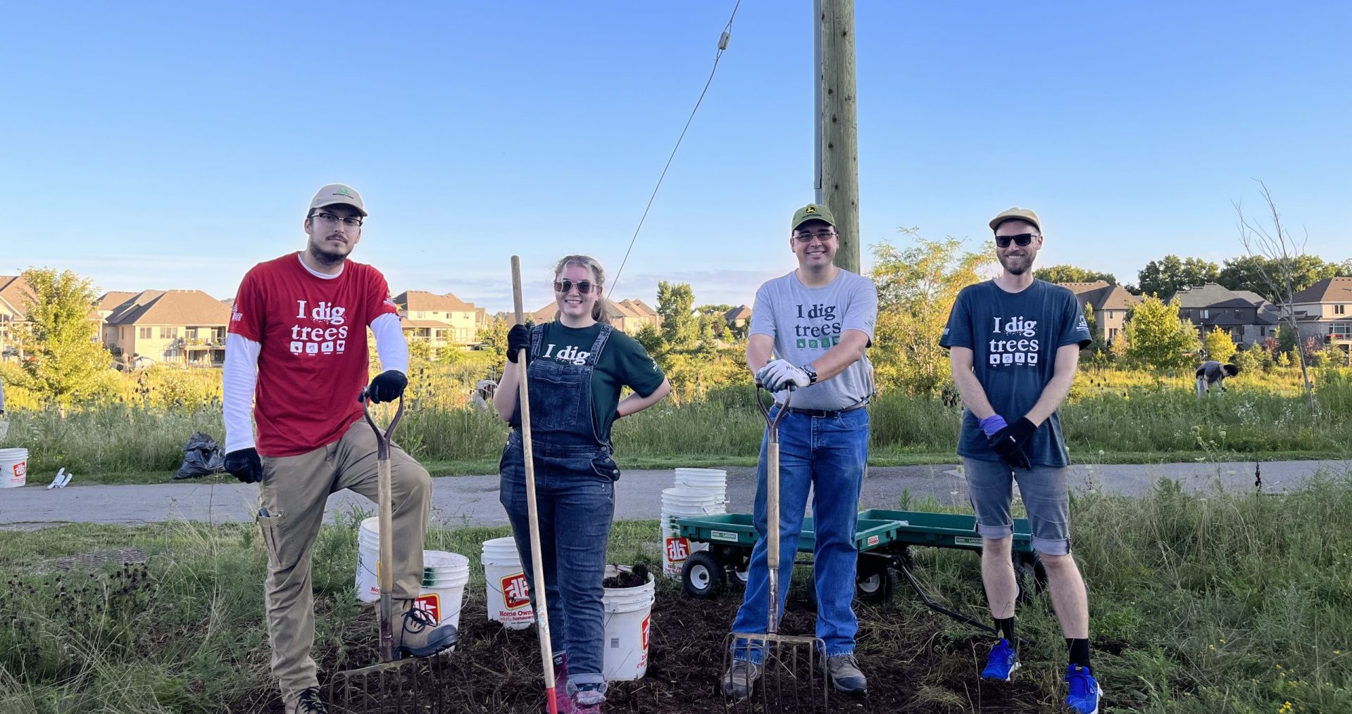 Staff and volunteers cared for previously planted trees through mulching, weeding, and maintaining the land. Plantings around stormwater ponds are very important for the local ecosystem: they help provide shade and habitat for local wildlife, prevent flooding and erosion, and improve air and water quality around the ponds. Aftercare is a crucial stage of every tree planting, as ensuring that trees are growing strong and being cared for means a healthier urban forest.