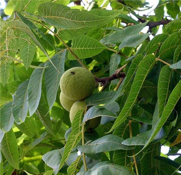 Its round nuts have a yellow-green husk, are 4-6 cm wide and contain a sweet, edible seed that is rich in oil. A black dye can be made from the husks, hence the name Black Walnut.